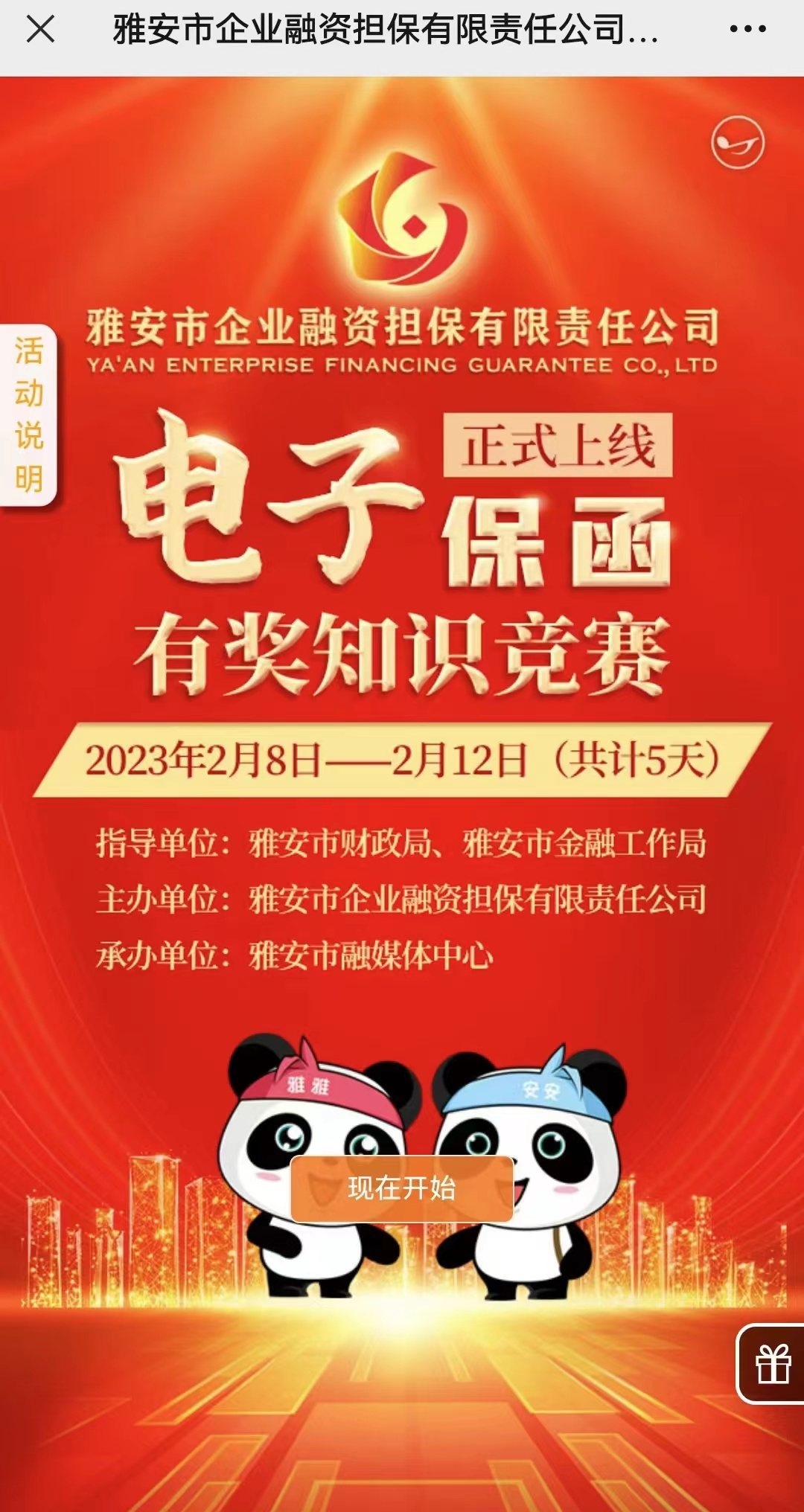該活動(dòng)由市財(cái)政局和市金融工作局指導(dǎo),雅安市企業(yè)融資擔(dān)保有限責(zé)任公司(以下簡(jiǎn)稱“市擔(dān)保公司”)主辦,雅安市融媒體中心承辦。市擔(dān)保公司作為我市唯一一家政府性融資擔(dān)保機(jī)構(gòu),也是雅安公共資源交易中心上線的唯一一家本地全類別保函服務(wù)商。2月6日,市擔(dān)保公司“電子投標(biāo)保函”業(yè)務(wù)雅安公共資源交易中心正式上線。為讓更多的受眾了解“電子投標(biāo)保函”業(yè)務(wù),市擔(dān)保公司主辦此次線上有獎(jiǎng)知識(shí)競(jìng)賽活動(dòng)。