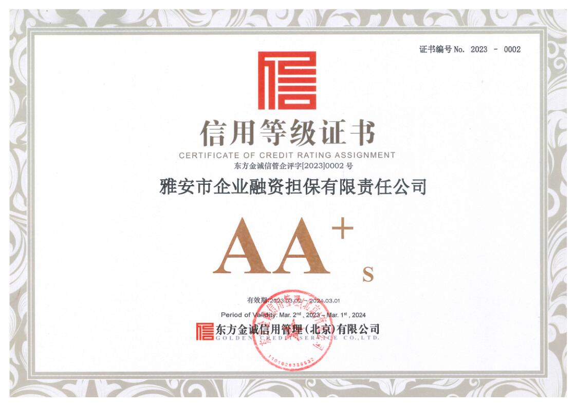 3月3日,雅安市企業(yè)融資擔(dān)保有限責(zé)任公司(以下簡稱“市擔(dān)保公司”)傳來喜訊,經(jīng)東方金誠信用管理(北京)有限公司通過對市擔(dān)保公司的信用狀況進(jìn)行綜合分析和評估,確定該公司信用等級為AA+。