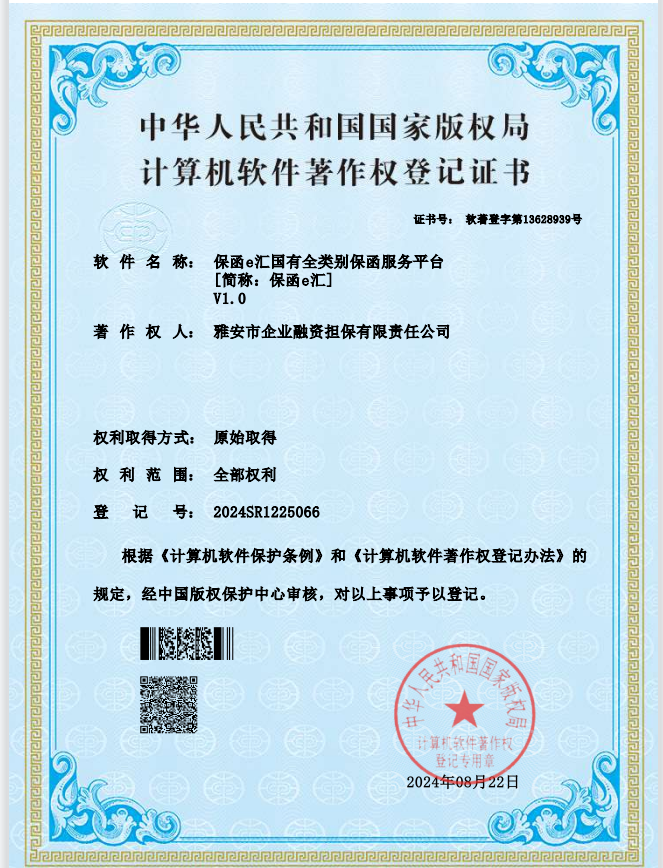 近日,由雅安市擔(dān)保公司開(kāi)發(fā)完成的《保函e匯國(guó)有全類別保函服務(wù)平臺(tái)(簡(jiǎn)稱:保函e匯)V1.0》軟件通過(guò)國(guó)家版權(quán)局的最終審查,獲得由中華人民共和國(guó)版權(quán)局頒發(fā)的計(jì)算機(jī)軟件著作權(quán)登記證書。